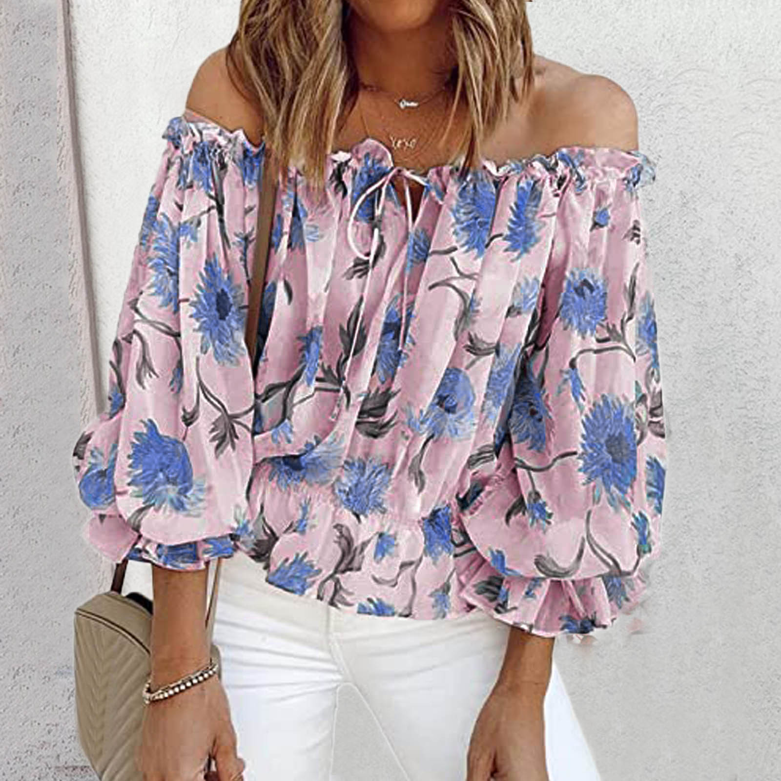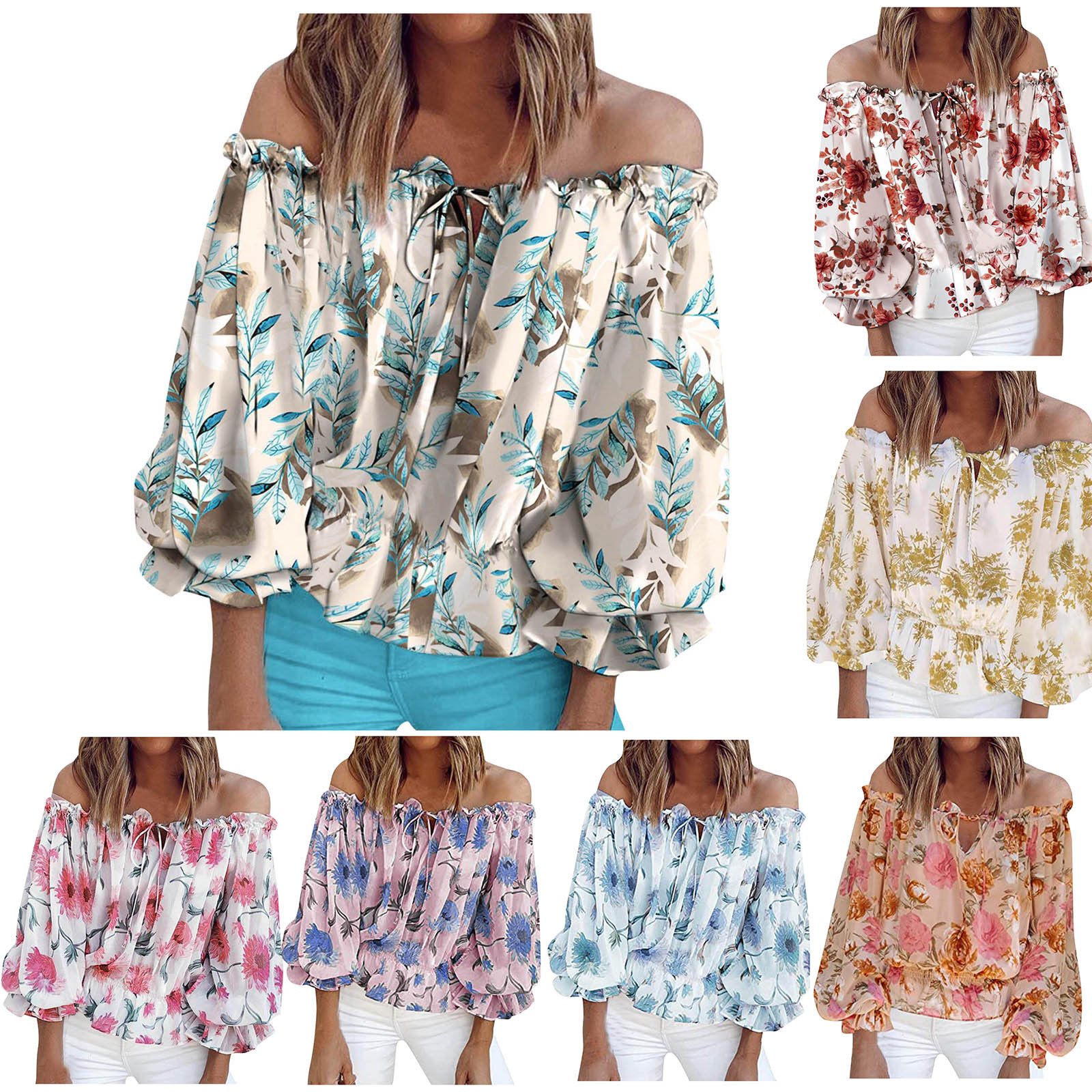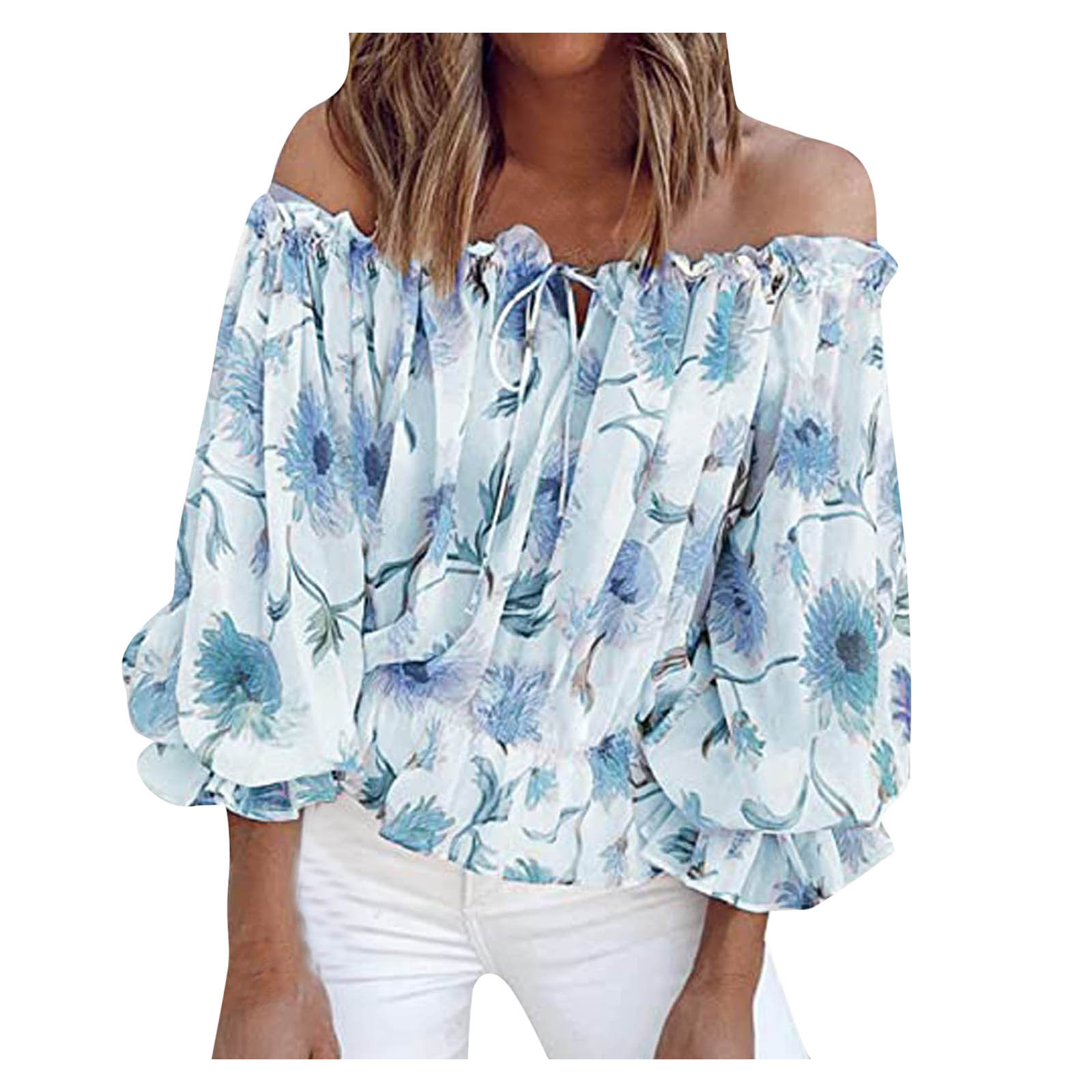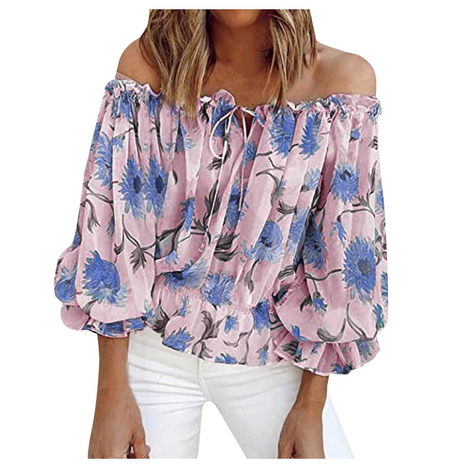 Fashion Floral Lace Up Blouse Sexy Off Shoulder O-Neck Tops Tee Casual Summer Ladies Female Women Long Sleeve Blusas Pullover